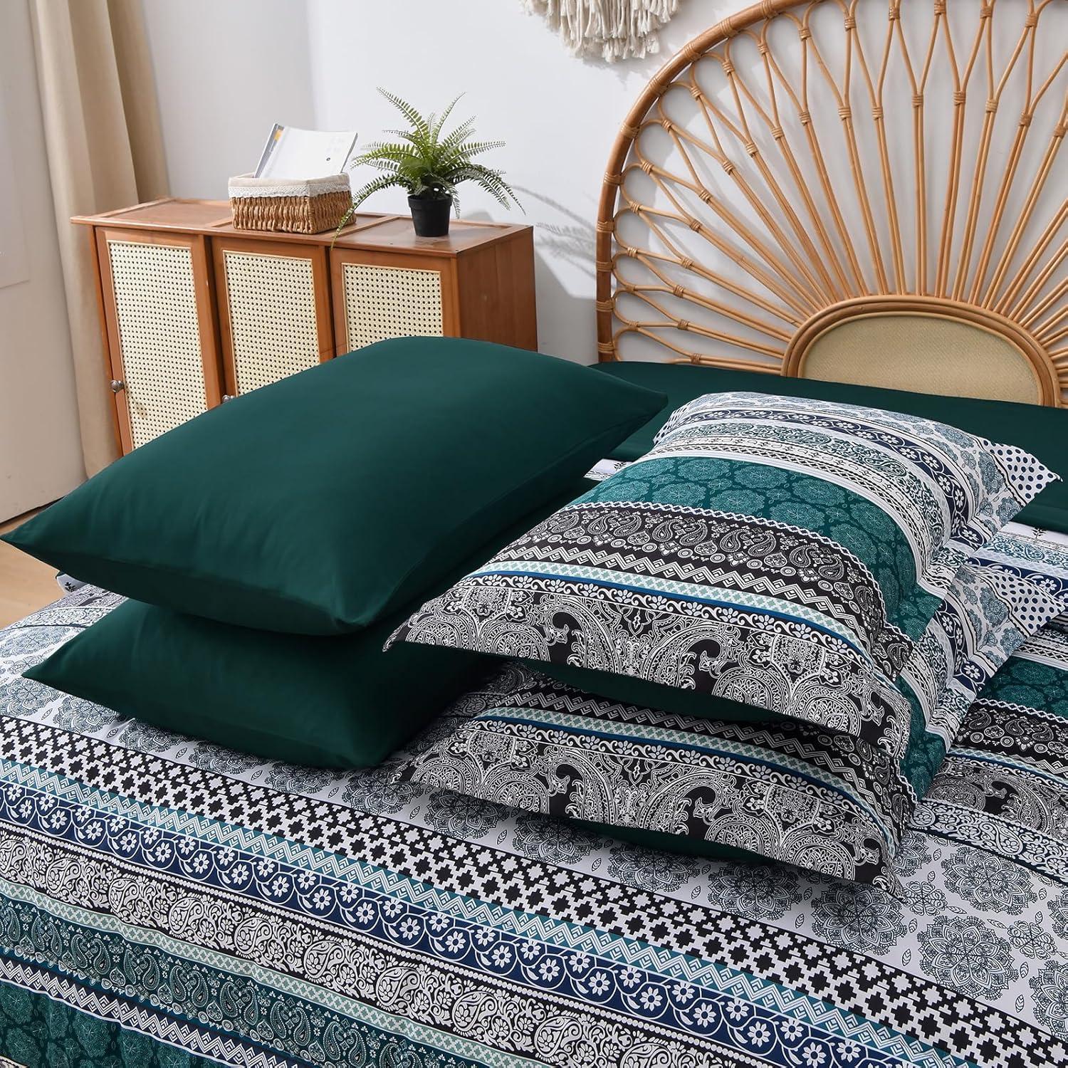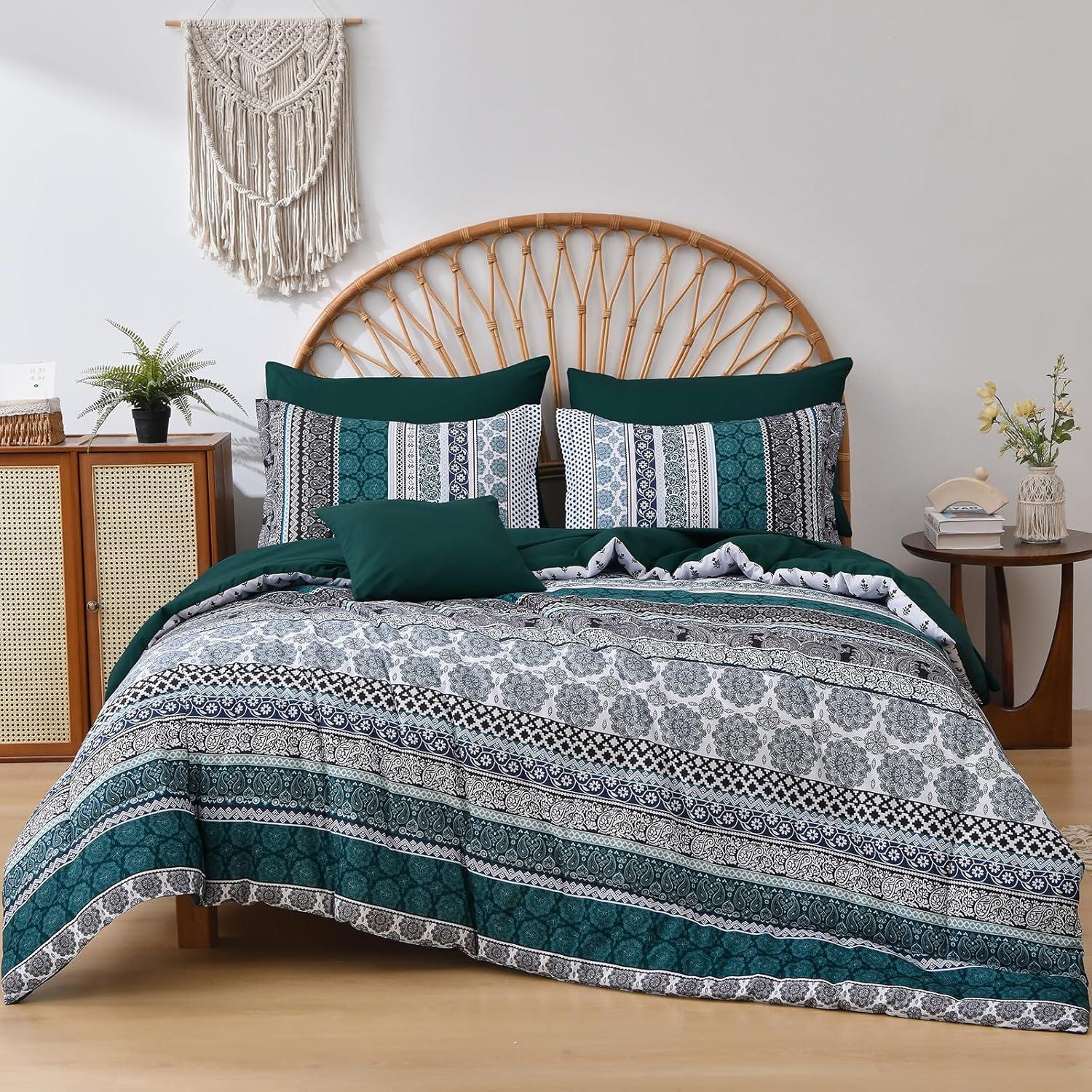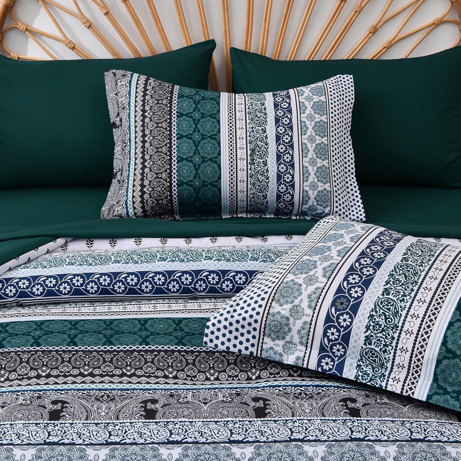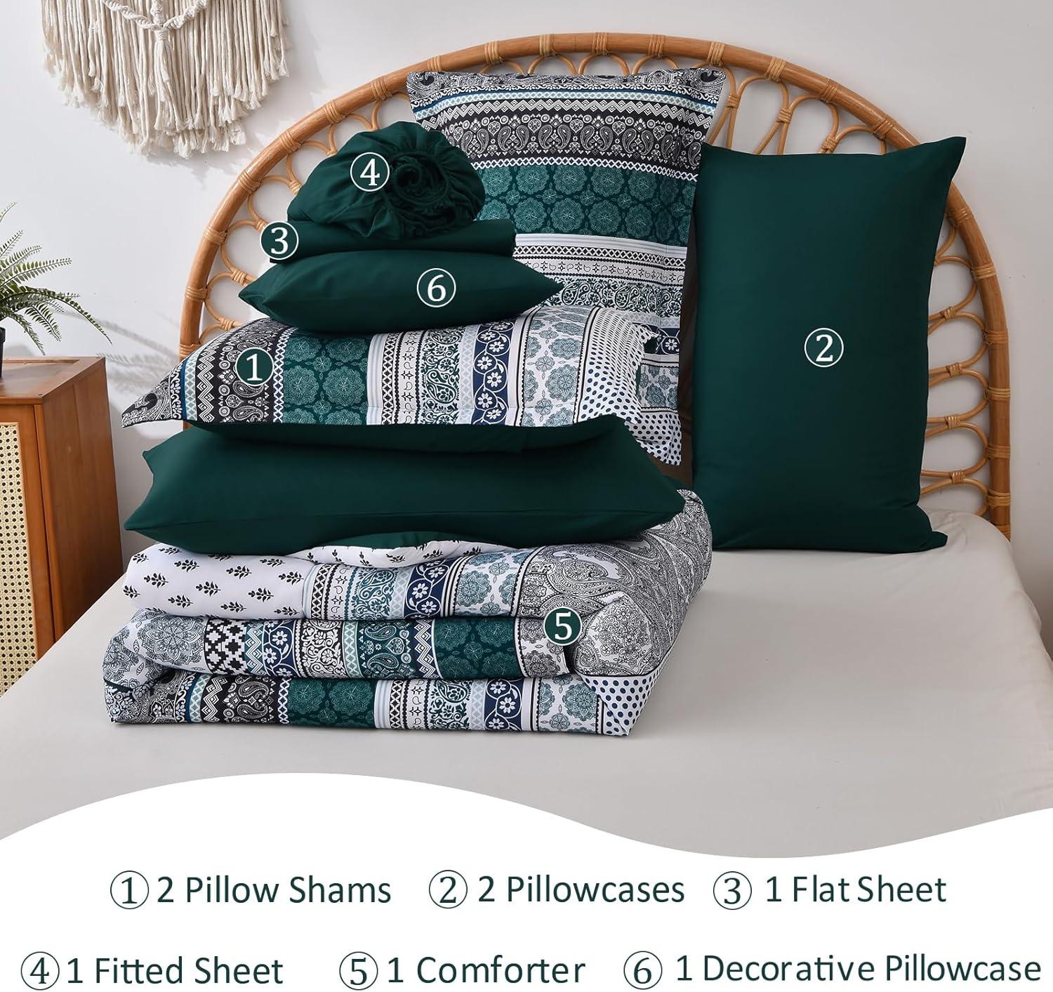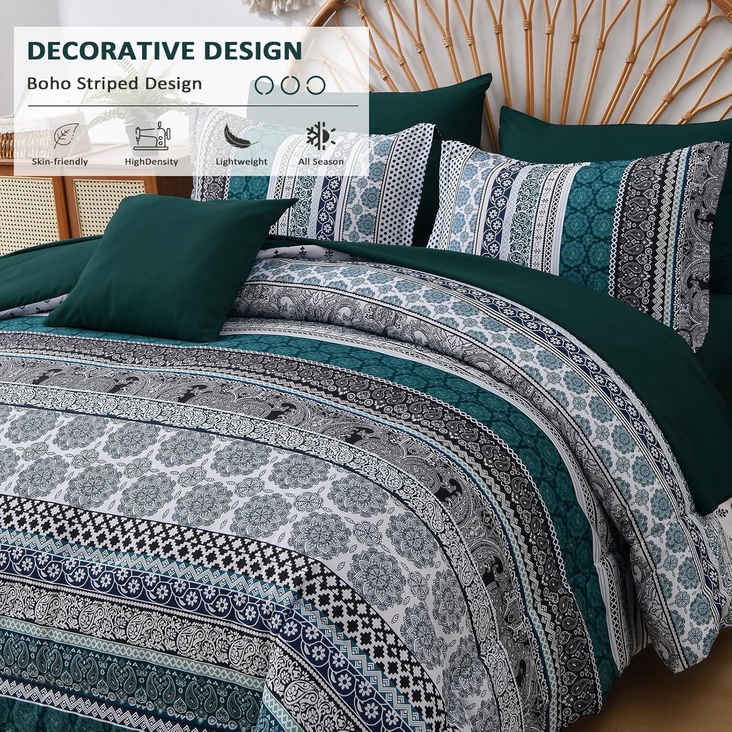 Cottolester Boho Comforter Set Queen Size,8 Piece Bed in a Bag Bohemian Striped Bedding Quilt Set,Purple Paisley Floral Comforter and Sheet Set,Soft Microfiber Complete Bedding Sets for All Season(Emerald Green)